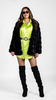 Black cozy knitted long sleeve zip up with silver hardware and distressed accents at waist and hood at back.