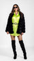 Black fluffy faux fur evening coat perfect for date night and heels elevating warmth! Featuring long sleeves and polyester lining.
