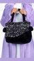 Grey fur purse with crystal-embellished wrist strap, featuring gold-tone hardware at zipper.