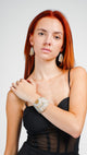 Adorn this beaded cuff of gold and silver with feather & native inspired designs of gold-tone hardware.