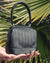 Black leather bowler bag with silver-tone hardware and single interior pocket.
