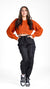 Orange warm and knitted distressed cropped polyester-blend long sleeve sweater with a single pocket at front.
