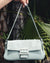 Blue jean shoulder bag featuring rhinestone accents at front with silver-tone hardware and single interior pocket.