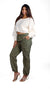 Fun and trendy green nylon pants with drawstring at waist, six pockets throughout and wide leg fit.