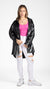 Black shiny and edgy patent leather long sleeve shirt with snap button closures at front, a single pocket at front and white stitching throughout.