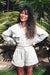 Lounge in this neutral-toned cotton two piece set with a long sleeve button up top and drawstring shorts with four pockets throughout.