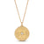 Gold-tone circular medal necklace with evil eye symbol at front and crystal embellishment.